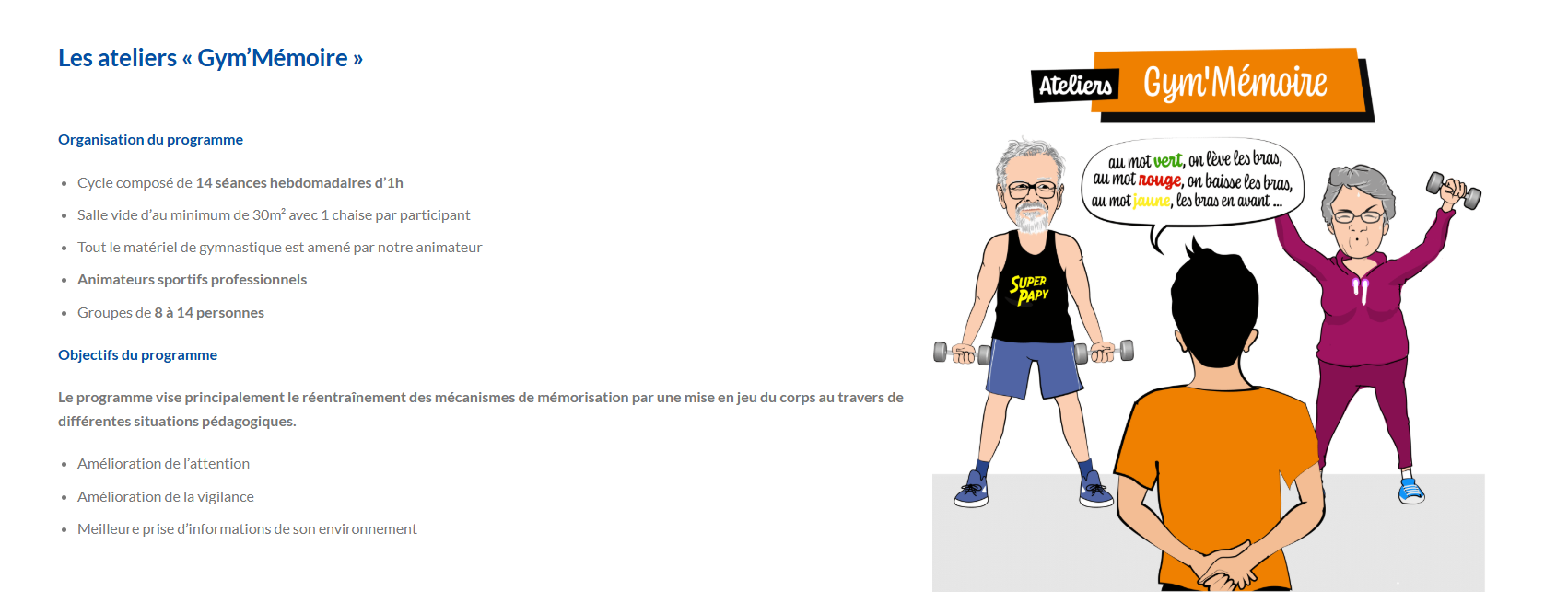 Égarer ses clés, oublier un rendez-vous, ne plus se souvenir du titre d'un film… Avec l'âge le cerveau perd de sa capacité à retenir les nouvelles informations. Cet atelier est basé sur une méthode originale, alliant pratique d'une activité physique régulière, une gymnastique intellectuelle et une bonne hygiène de vie pour entretenir votre mémoire.