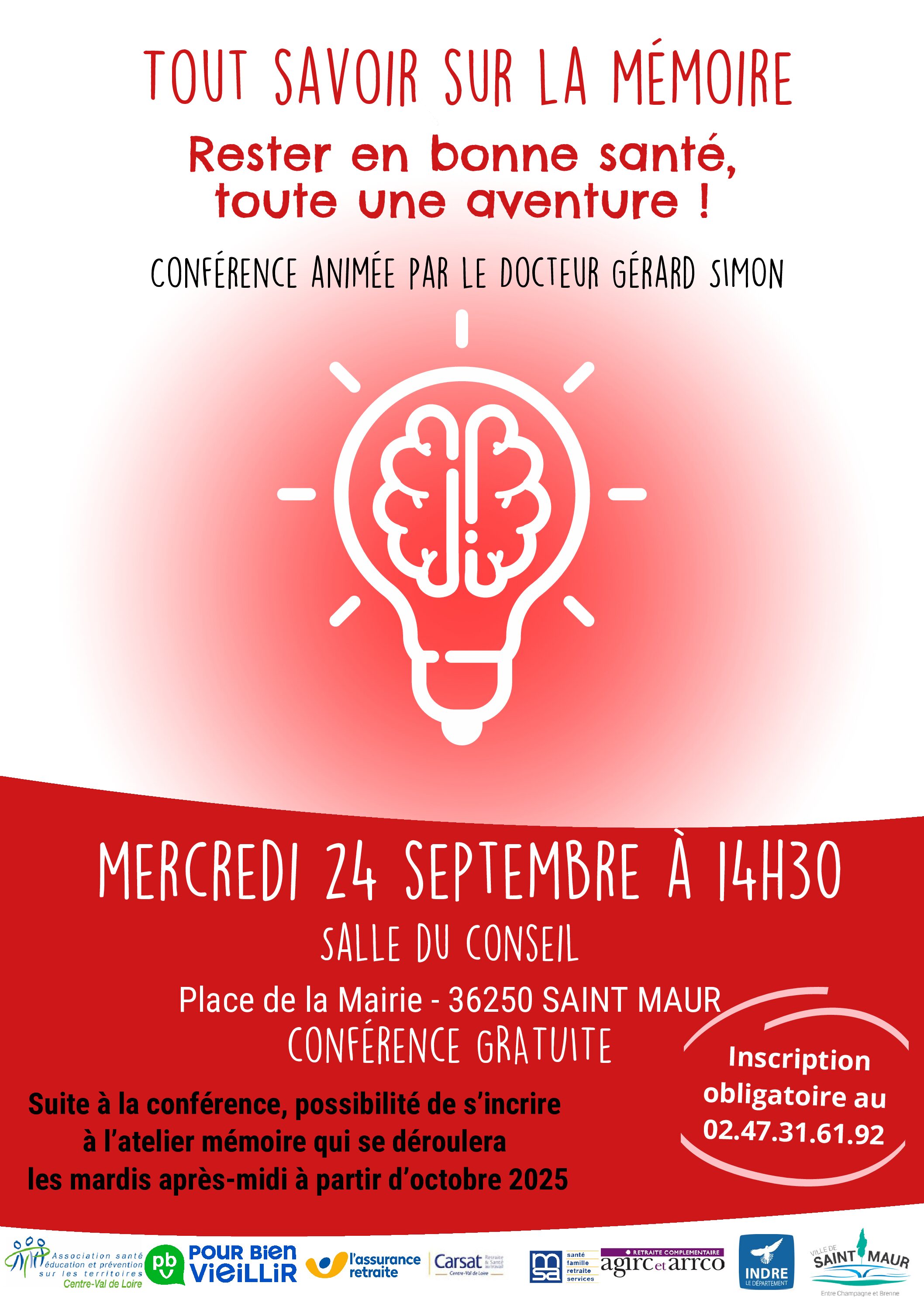 Notre partenaire, l’ASEPT Centre Val de Loire et la commune de SAINT MAUR vous invitent à participer à une conférence sur le thème de la Mémoire, animée par le Docteur Gérard Simon, médecin généraliste, spécialiste en gériatrie, le mercredi 24 septembre à14h30 à la salle du Conseil - place de la Mairie - 36250 SAINT MAUR.