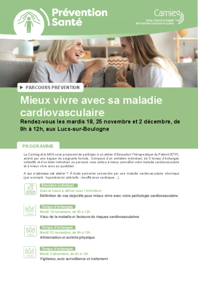 Vous êtes atteint(e) d’une maladie cardiovasculaire chronique ? Vous souhaitez être mieux informé(e) ou maintenir vos connaissances sur la pathologie qu’est la vôtre ? Cet atelier est fait pour vous !
